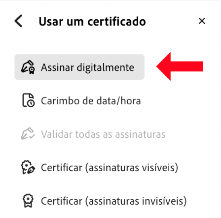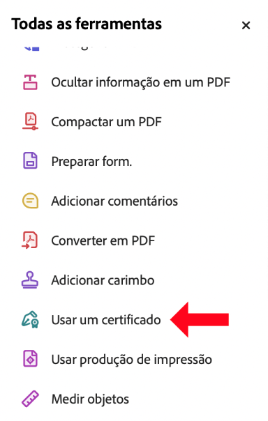 Passo 3: Selecionar no painel de ferramentas do Acrobat a opção “Usar um certificado”.