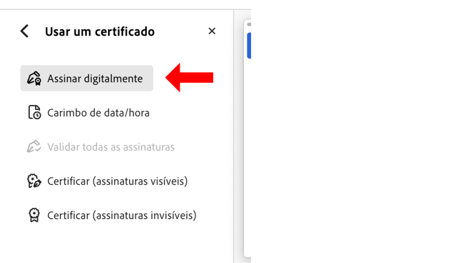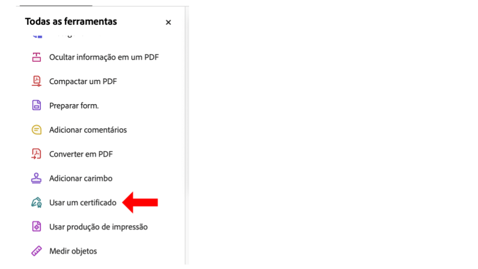 Passo 3: Selecionar no painel de ferramentas do Acrobat a opção “Usar um certificado”.